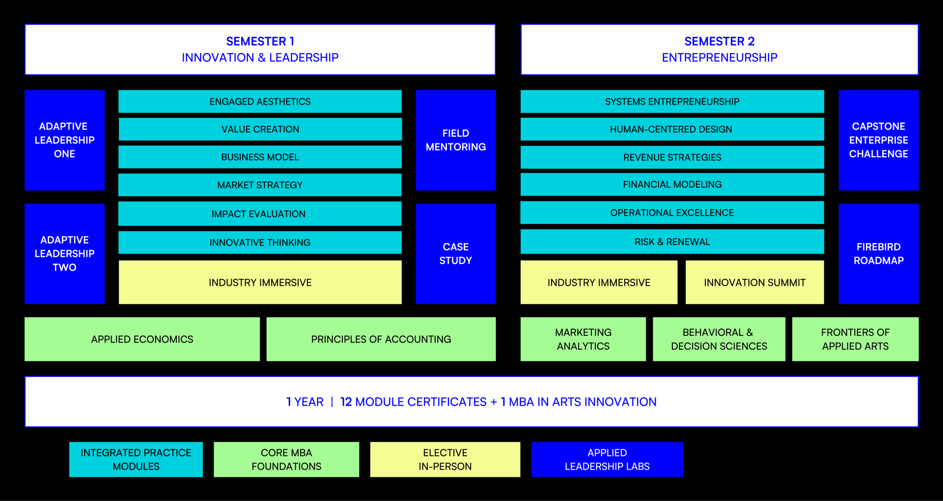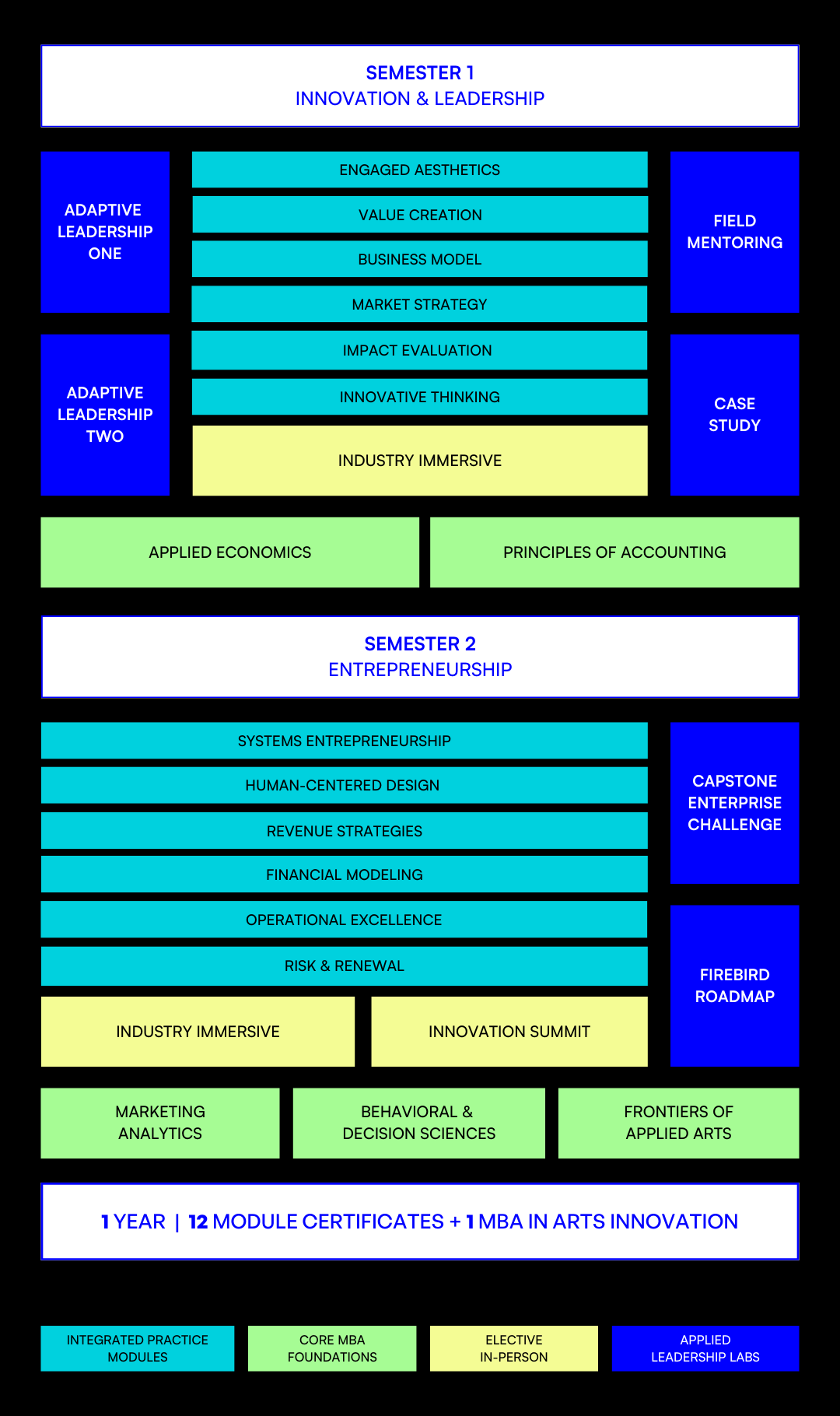 The Global Arts MBA curriculum addresses the complex challenges of today’s creative impact landscape through a sequence of curated modules, core MBA foundations, and collaborative team labs, each building on the last. Combining the flexibility of distributed learning with the immersive power of in-person retreats, this program delivers a growth experience that is both highly efficient and profoundly transformative.